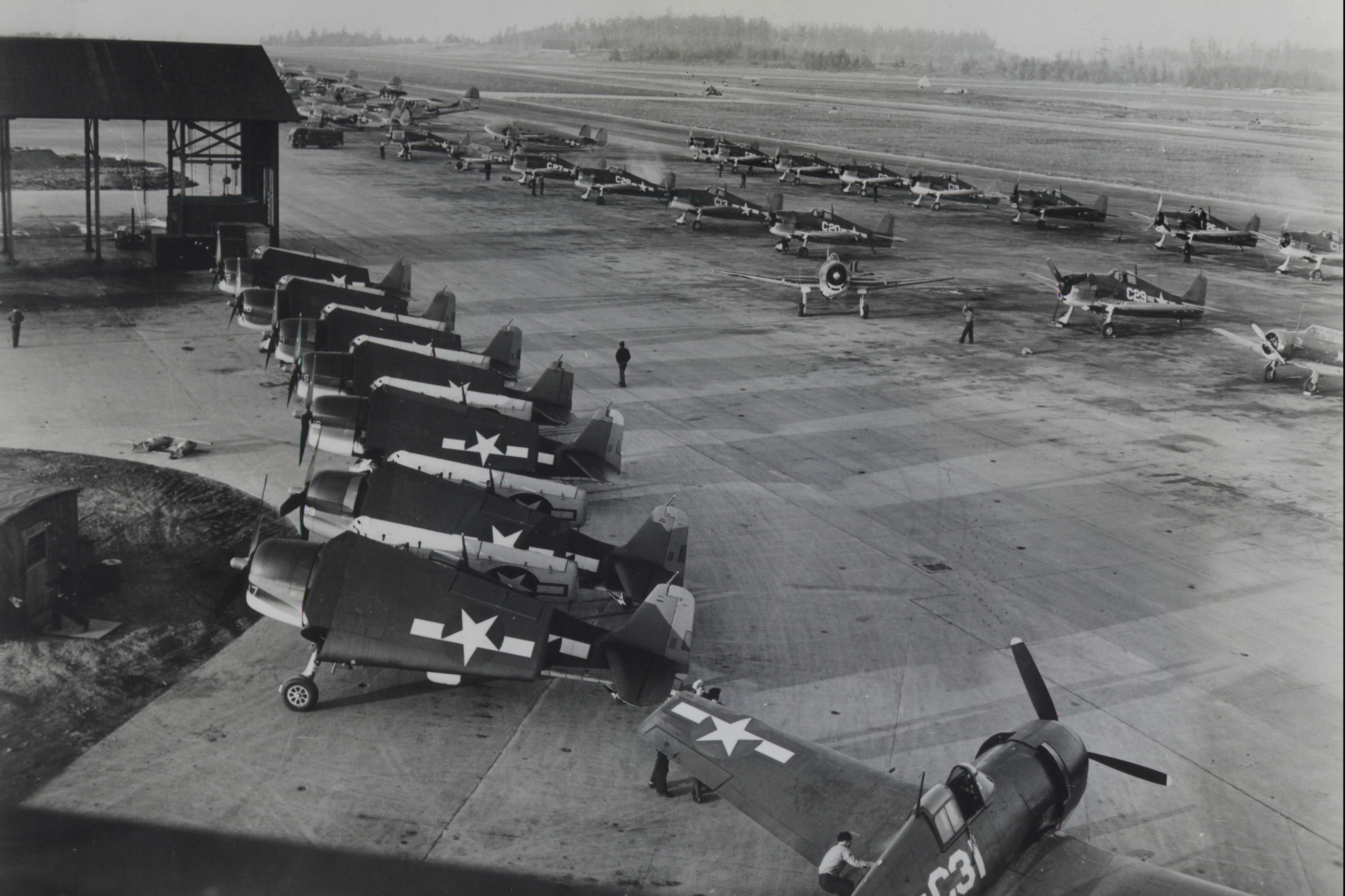 Over at Ault Field, the earliest squadrons of aircraft were F4F Wildcats, which came aboard in 1942, followed by F6F Hellcats. Later that year, PV-1 Venturas arrived for training. By the end of 1943, the F4Fs were gone, replaced by the F6F Hellcats. In 1944, SBD Dauntless dive-bombers became the predominant aircraft at Ault Field.