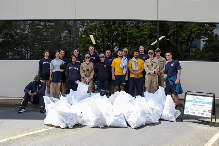 PORTLAND, Oregon - PORTLAND, OREGON (June 5, 2025) – U.S. Navy Sailors pose for a group photo while volunteering with SOLVE: Stop Oregon Litter and Vandalism during a downtown clean up event at Portland Fleet Week during the 118th Rose Festival, June 5, 2025. Portland Fleet Week is a time-honored celebration of the sea services and provides an opportunity for the citizens of Oregon to meet Sailors, Marines and Coast Guardsmen, as well as witness firsthand the latest capabilities of today’s maritime services. (U.S. Navy Photo by Mass Communication Specialist 2nd Class Kassandra Alanis)