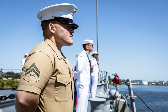 PORTLAND, Oregon - PORTLAND, OREGON (June 3, 2025) – U.S. Marine Corps Cpl. Grayson Baggett an infantryman assigned to Battel Space Surveillance Company, 1st Intelligence Battalion, I Marine Expeditionary Force Information Group, and a native of Georgia, mans the rails of the Arleigh Burke-class guided missile destroyer USS Jack H. Lucas (DDG 125) sailing in the Willamette River as it arrives for Portland Fleet Week during the 118th Rose Festival, June 3, 2025. Portland Fleet Week is a time-honored celebration of the sea services and provides an opportunity for the citizens of Oregon to meet Sailors, Marines, and Coast Guardsmen, as well as witness firsthand the latest capabilities of today’s maritime services. (U.S. Marine Corps photo by Cpl. Peyton Kahle)